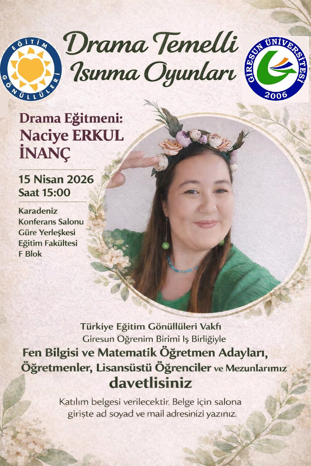 Drama Eğtimeni Naciye ERKUL İNANÇ tarafından 15 Nisan 2026 tarihinde saat 15:00'da Karadeniz Konferans Salonunda öğretmen ve öğretmen adaylarına "Drama Temelli Isınma Oyunları" ile ilgili eğitim verilecektir.