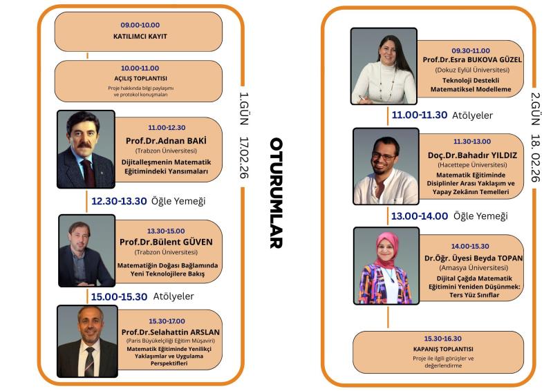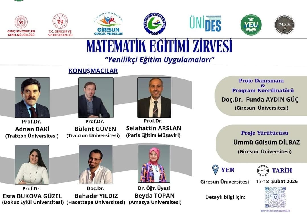 Doç. Dr. Funda AYDIN GÜÇ'ün proje danışmanı, matematik öğretmeni adayı Ümmü Gülsüm DİLBAZ'ın proje yürütücüsü olduğu "Matematik Eğitimi Zirvesi: Yenilikçi Eğitim Uygulamaları" isimli ÜNİDES projesi 17-18 Şubat 2026 tarihinde Giresun Üniversitesi Mevlana Celaleddin-i Rumi Konferans salonunda yapılacaktır. Herkes davetlidir.